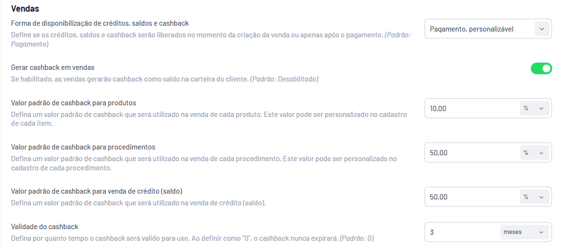 Nas configurações de vendas, é possível definir valores diferentes para cada produto ou ainda definir um padrão que será replicado para todos os produtos vendidos e o valor é creditado na carteira do cliente.