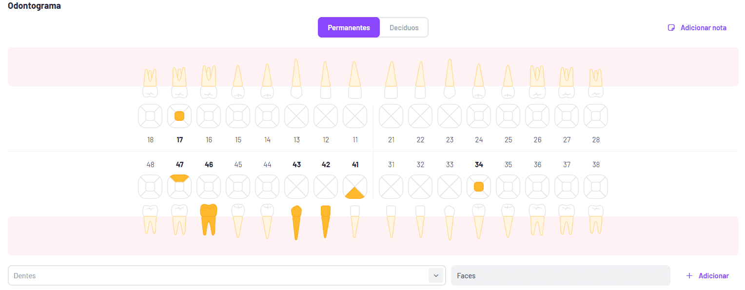 Além disso, basta clicar sobre um dente ou região para adicionar notas e observações clínicas. Você pode aplicar descontos unidade a unidade, inserindo o valor ao lado de cada dente, ou oferecer um desconto sobre o total do orçamento.