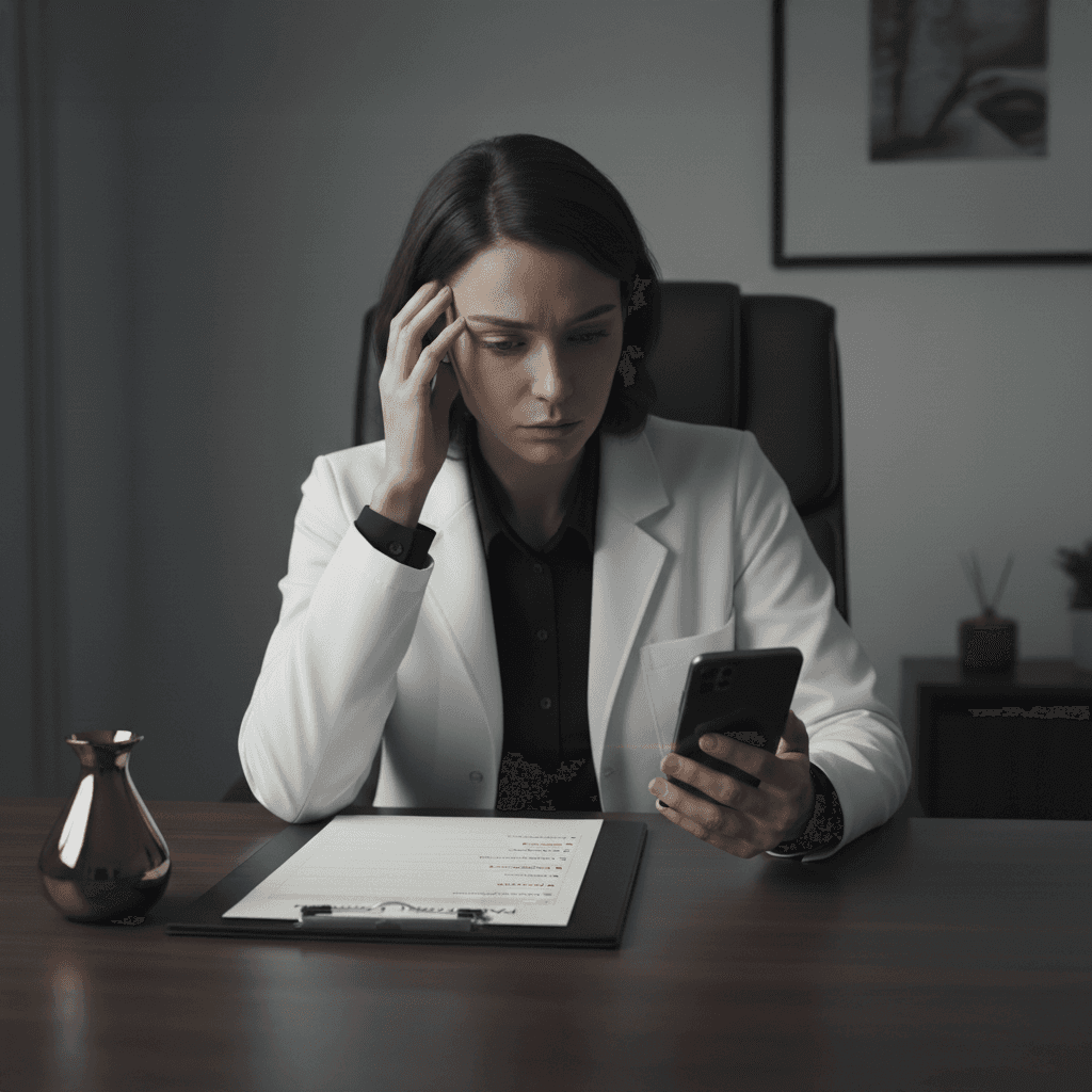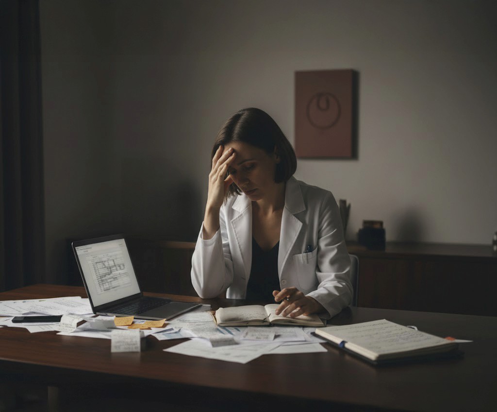 A Anna escuta a consulta, transcreve o diálogo e sugere anotações técnicas para o prontuário. Foto total no paciente.