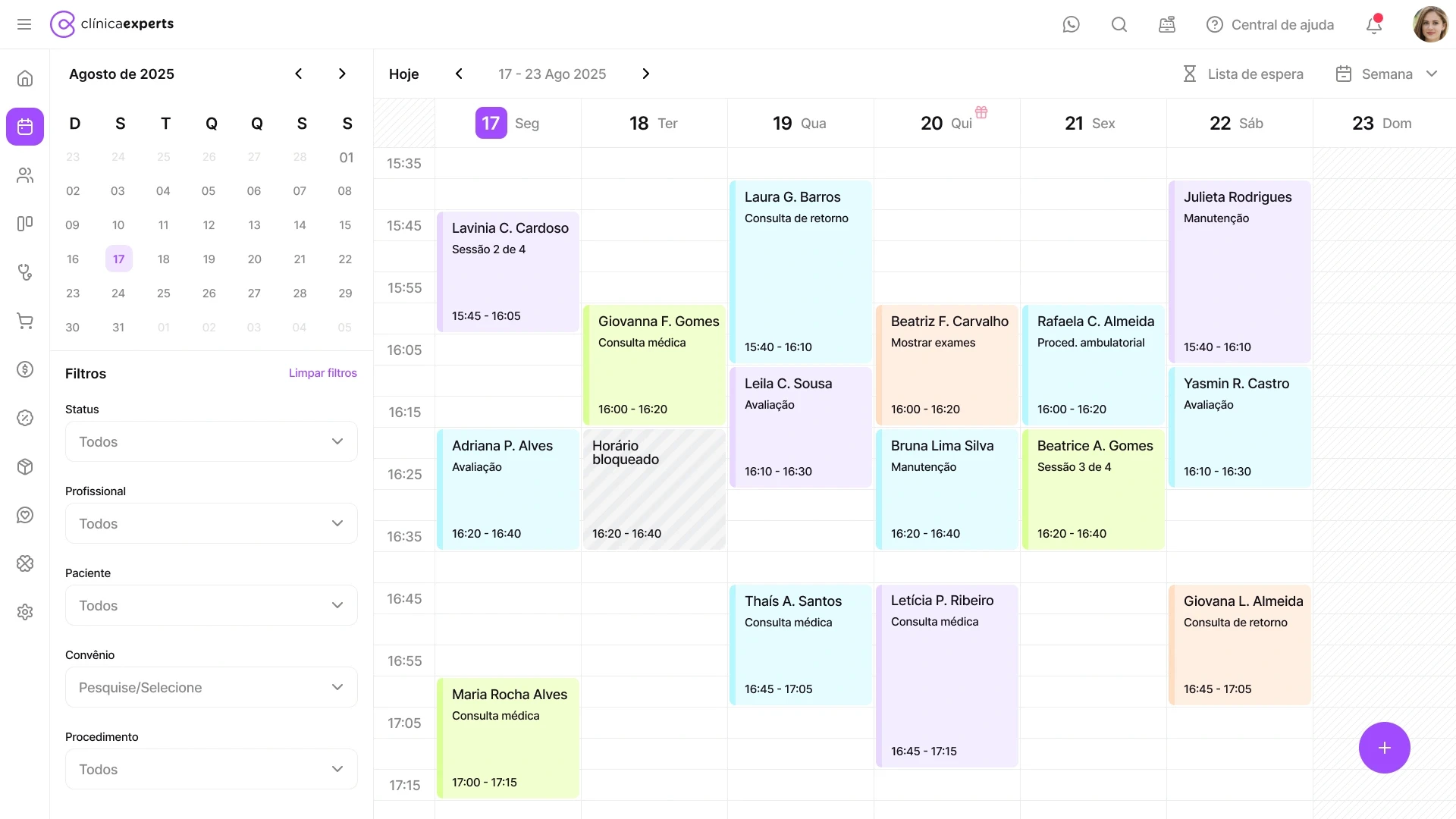 Vários filtros de visualização, controle de equipamentos e salas, integrada com estoque e financeiro.